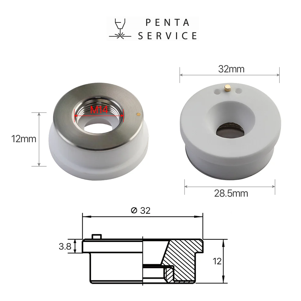 Керамическая проставка является держателем сопла диаметром 32 мм. Выполняет изоляционные функции, препятствует нагреванию нижних частей лазерной головки. Резьба M14 на проставке соответствует резьбе на сопле.